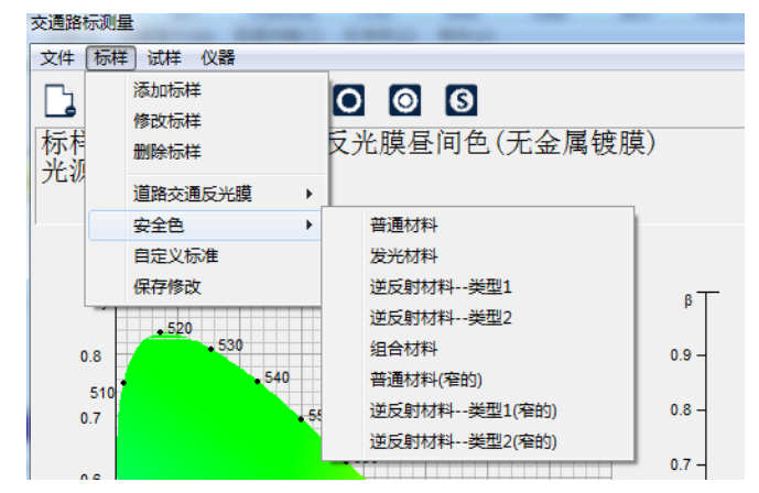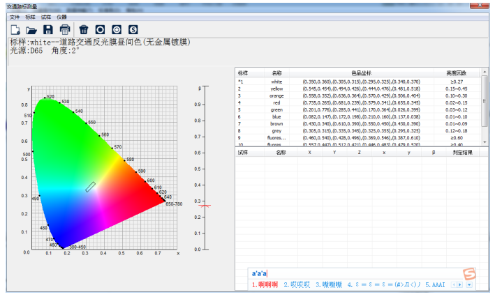 專用于交通路標(biāo)、標(biāo)線、反光膜的亮度因數(shù)、色品坐標(biāo)測量,內(nèi)含《GB 2893安全色》、《GB/T 18833道路交通反光膜》標(biāo)準(zhǔn),可手動自定義多邊形矩形容差。