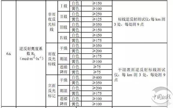 國家標(biāo)準(zhǔn)GB/T16311《道路交通標(biāo)線質(zhì)量要求和檢測方法》規(guī)定,道路交通標(biāo)線使用期間逆反射系數(shù)RL:白色標(biāo)線RL不低于80mcd,黃色標(biāo)線RL不低于50mcd。